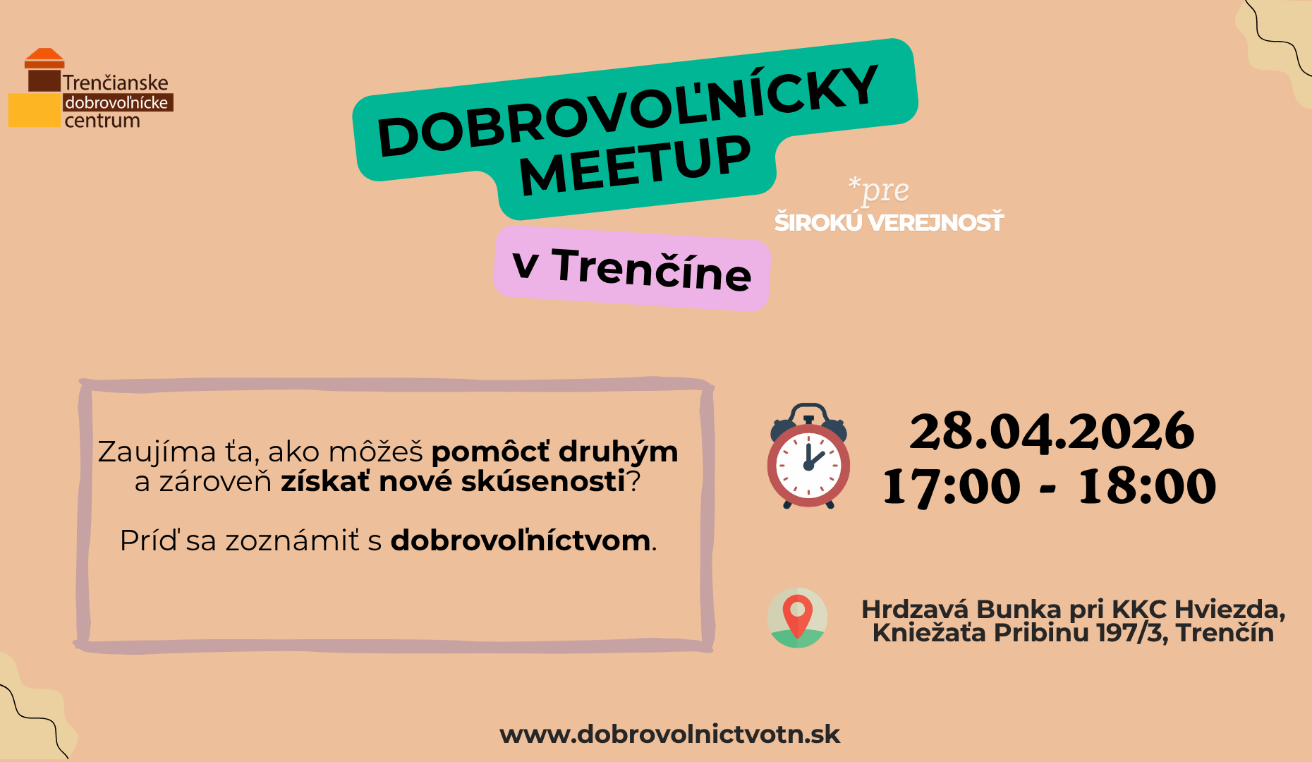 Dobrovoľnícky Meetup je informačné stretnutie a diskusia pre záujemcov o dobrovoľníctvo. Zaujíma vás dobrovoľníctvo ale neviete ako začať? Na stretnutí vám predstavíme tému dobrovoľníctva, ukážeme si príklady dobrej praxe a zodpovieme na zvedavé otázky o dobrovoľníctve. Samozrejme nebudú chýbať informácie o kampani Týždeň dobrovoľníctva. Udalosť je určená pre širokú verejnosť bez vekového obmedzenia.